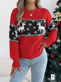 Christmas Woman Sweaters Autumn Winter 2025 Casual Round Neck Contrast Color Snowflake Deer Pattern Long Sleeve Pullover