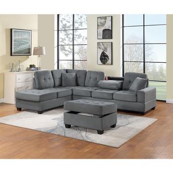 Dark Gray Plush Microfiber Living Room Furniture 3PCS Reversible Sectional Sofa Set Sofa w Cup Holder Reversible Chaise And Sto