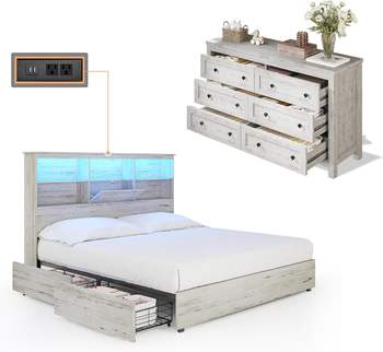 2-Piece Bedroom Set, Queen Bed Frame and 6 Drawer Dresser, Platform Bed with 51.2″ LED Bookcase Headboard & 4 Under-Bed Drawers
