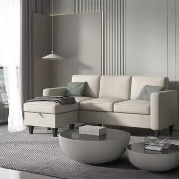 Convertible L-Shaped Sectional, Modern Linen Fabric 3-Seat Sofa Couch Furniture Set with Storage Ottoman