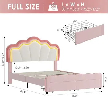 Full Upholstered LED Bed Frame with Storage Drawers, Bed with Adjustable Lotus Headboard, Velvet Princess Platform Bed Frame