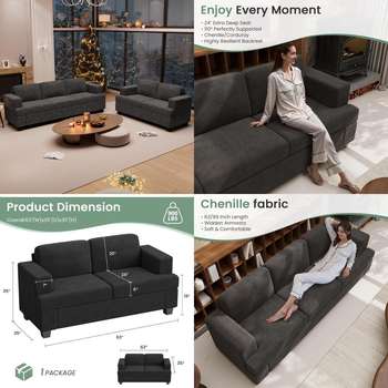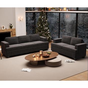 Comfy 2-Piece Sofa Set: 3-Seater & Loveseat with Deep Seats, Modern Sleeper Couch for Living Room, Dark Grey Chenille