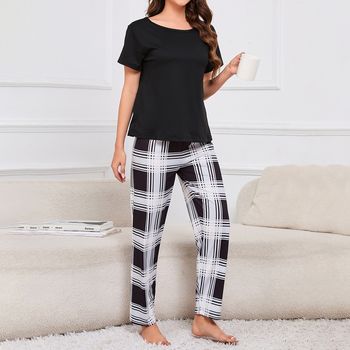 Women s Cozy Plaid Print Pajama Set with Long Lantern Sleeves and Elastic Waistband – Button Down Top and Lounge Pants for Fall